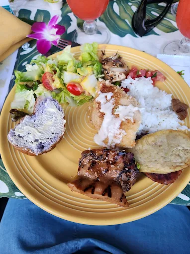 - Hawaiian Luau Buffet: ํ์์ด ์ ํต ์๋ฆฌ, ํด์ฐ๋ฌผ, ํ๋ผ์ ๋ฆฝ ๋ฑ ๋ค์ํ ๋ทํ.
