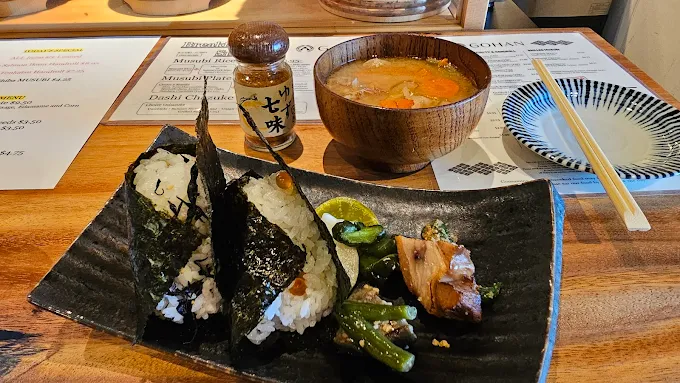 - Musubi Plate ($11.95): ๋ฌด์๋น 2๊ฐ + ๋ฏธ์์ํ or ๋์ง๋ฃจ(+ $2) + ์ ์ฑ(์ ์ & ์๋ฐ์ฐฌ) ๊ตฌ์ฑ Onolicious Hawaiสปi+1.