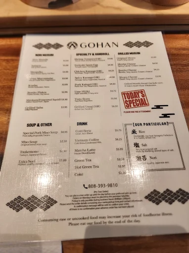 - ํด๋์ ๋ฌด์๋น: ์๊ธ๋ฐฅ(Shio), ์ฐ์ด(Shio Salmon, $3.50), ์ฐธ์น ๋ง์(Tuna Mayo, $3.50), ์ ์ฆ ์ด์ฟ ๋ผ(Yuzu Ikura, $5.50) ๋ฑ Honolulu Magazine.